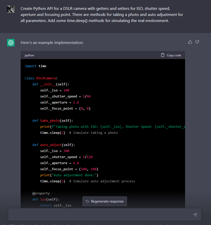 Pro účely tohoto článku jsem potřeboval nějakou ukázkovou aplikaci, která by se podobala mému použití při testování aplikace pro elektronový mikroskop. Napadlo mě API pro ovládání digitálního fotoaparátu — je to sice něco jiného než mikroskop, ale nějaké čočky se zde najdou také. A protože jsem líný, nechal jsem ChatGPT, ať mi takové API vytvoří.
