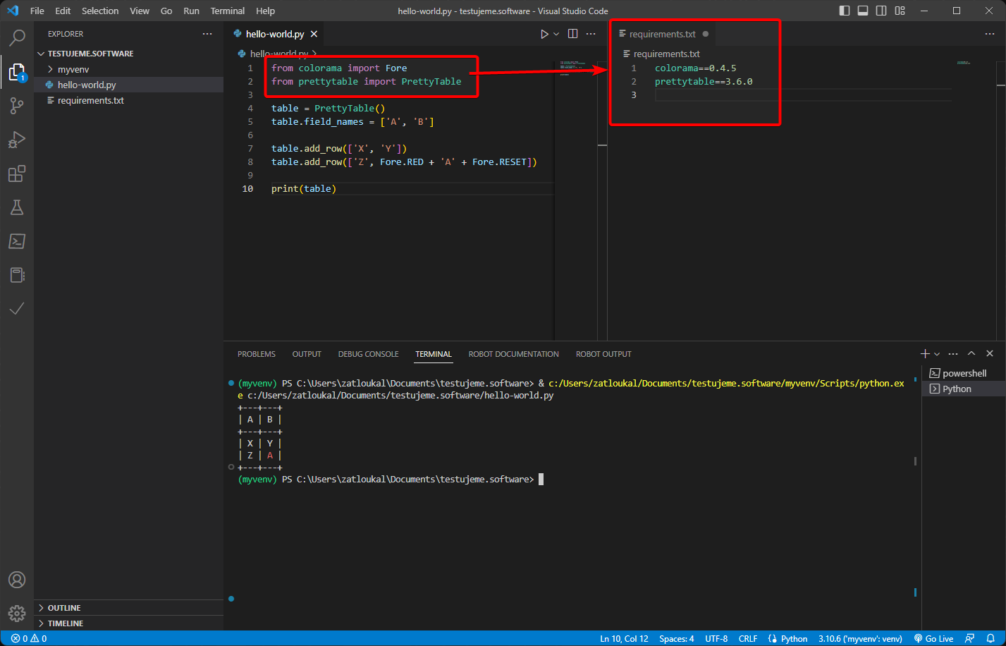 Nyní už můžete začít programovat váš projekt a instalovat balíčky pomocí příkazu pip install. Pokud máte aktivované prostředí, balíčky se instalují jen do tohoto prostředí. Pro příklad jsem si do svého prostředí nainstaloval pytest.