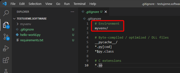 Soubory a složky, které nechcete do gitového repozitáře ukládat, můžete uvést v souboru .gitignore. V našem případě přidáme jako první složku s naším prostředím. Můžeme ale také přidat nějaké další složky a soubory. Pro lepší představu se můžete podívat například na šablonu Githubu.