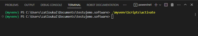 .\myvenv\Scripts\activateŽe je prostředí aktivováno, poznáte podle toho, že je jeho název uveden na začátku každého nového řádku v příkazové řádce.