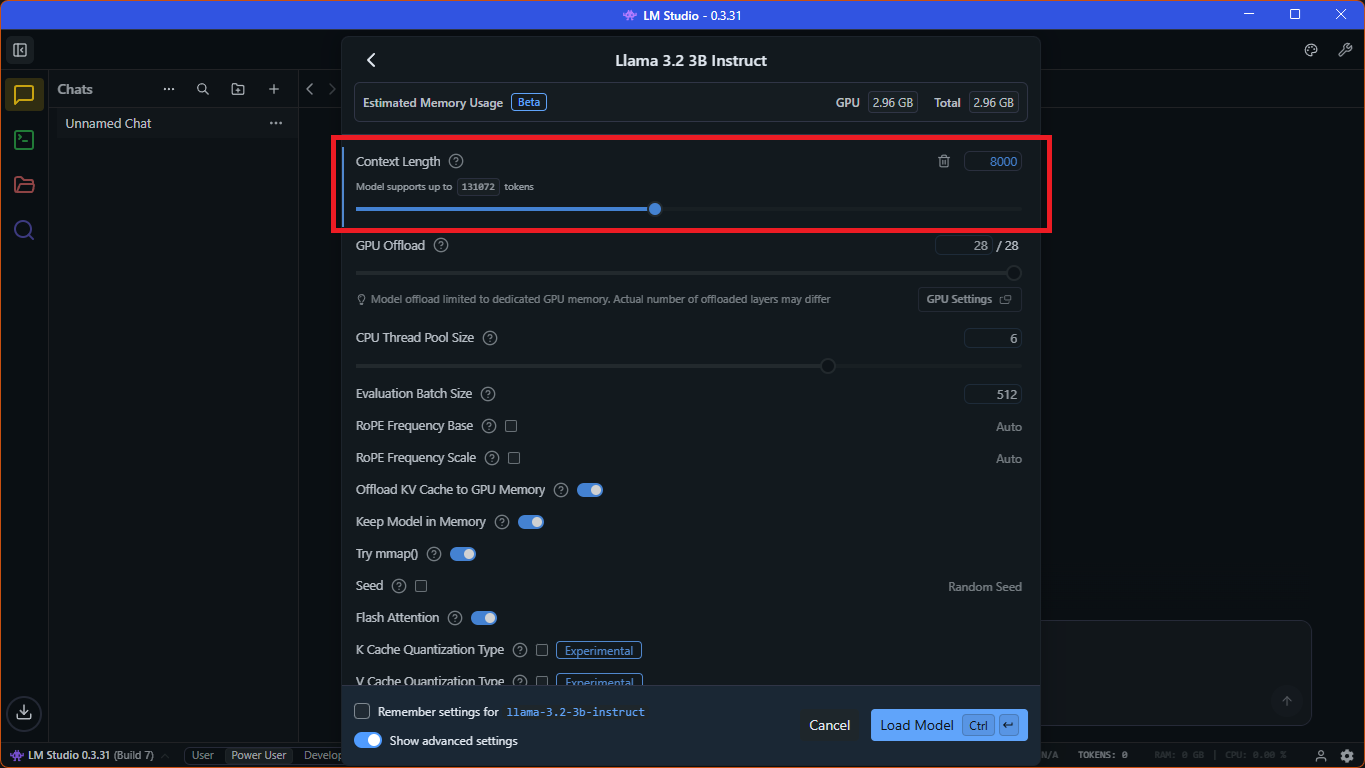 Pokud chcete upravit parametry modelu, můžete rovnou kliknout na tlačítko "Select a model to load" nahoře a zapněte přepínač "Manually choose model load parameters" v kontextovém okně, které se objeví. Klikněte na vybraný model, okno se změní a můžete upravovat řadu parametrů. Sám obvykle měním počet tokenů pod možností "Context Length" z původních 4096, abych mohl v jednom dotazu najednou prohledávat více úryvků (anglicky snippet) z vlastních dokumentů. Dobře mi fungovala hodnota okolo 8000, taková délka by se ještě měla vejít do paměti mojí grafické karty, takže odpověď modelu by stále měla být vygenerovaná rychle. Když zvolíte příliš vysokou hodnotu, tak se model načte i do paměti RAM, což bude mít zásadní dopad na rychlost generování. Podívejte se na snímek dole, kde je vidět upravená hodnota.