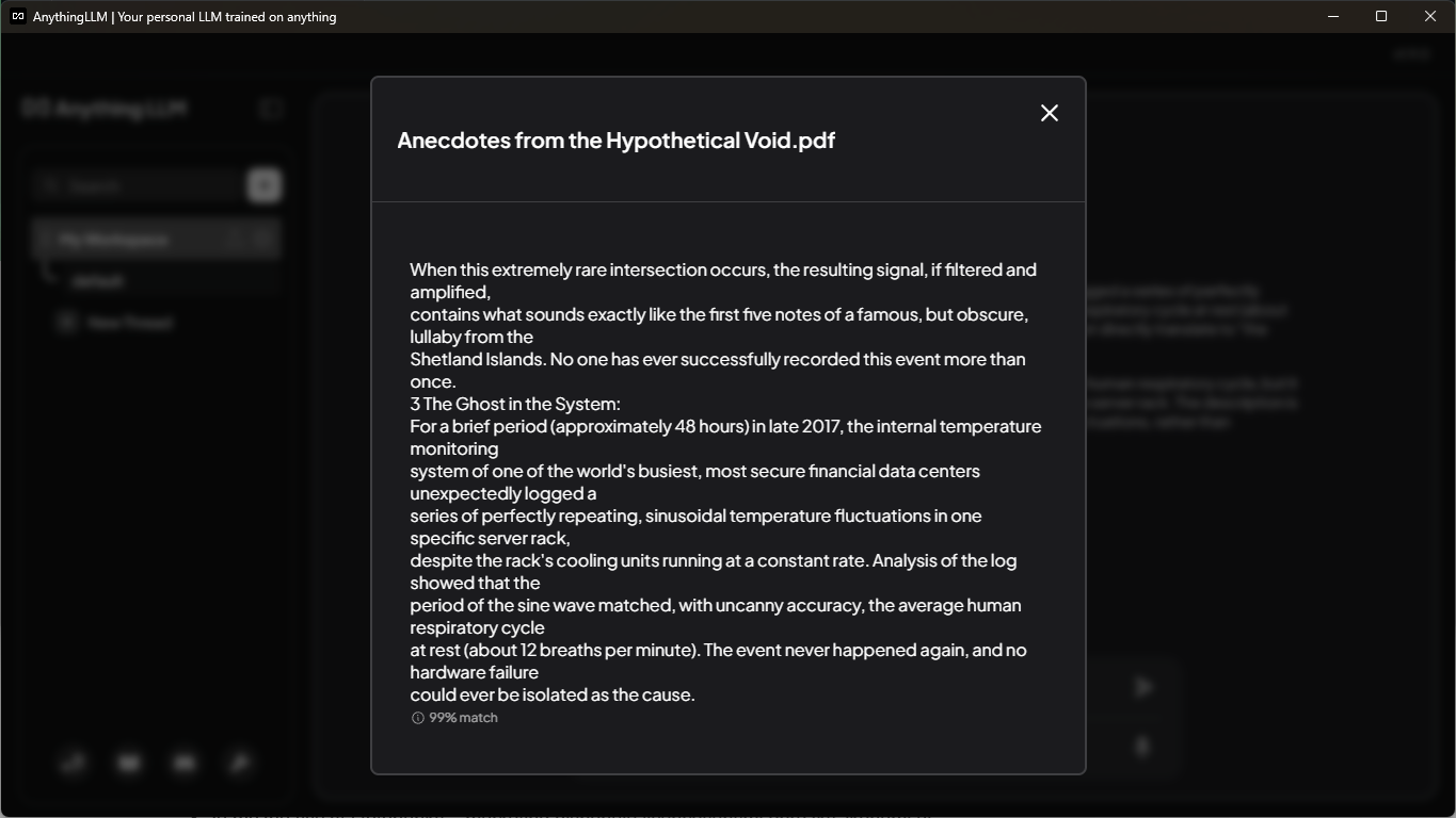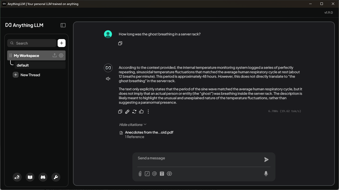 Konečně můžete položit dotaz zpět v pracovním prostoru. Vygeneroval jsem pár náhodných faktů a uložil jsem je jako PDF soubor. Když položím velmi konkrétní otázku, v kontextu pro LLM se použijí úryvky z vybraných dokumentů, a díky tomu lze používat informace, které jsou jinak důvěrné. Na dalším snímku obrazovky můžete vidět, že jsem dostal odpověď i na tak podivnou otázku, navíc můžu potvrdit, že 48 hodin je správná hodnota.