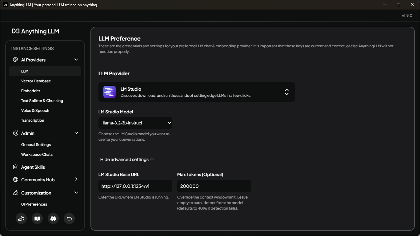 Už jsem zmiňoval, že by šlo použít jeden nástroj pro LLM i RAG, což AnythingLLM splňuje, ale nenašel jsem možnost v něm měnit parametry modelu, převážně délku kontextu. Proto používám podporu pro připojení k LM Studiu, kde mám model přednastavený. Když půjdete do nastavení kliknutím na ikonku klíče v levém dolním rohu, můžete vybrat "LLM" pod "AI Providers" v levém panelu. Vyberte "LM Studio" jako "LLM Provider", to by mělo mít přednastavené hodnoty pod pokročilým nastavením. Na stejném místě můžete, a měli byste, upravit hodnotu "Max Tokens", doporučuji použít hodnotu vyšší, než jakou jste nastavili pro model. Díky tomu se vám zobrazí chyba, když délka kontextu bude vyšší než u modelu, jinak AnythingLLM ořízne váš dotaz, aby se vešel do kontextu a vy tak ztratíte data.