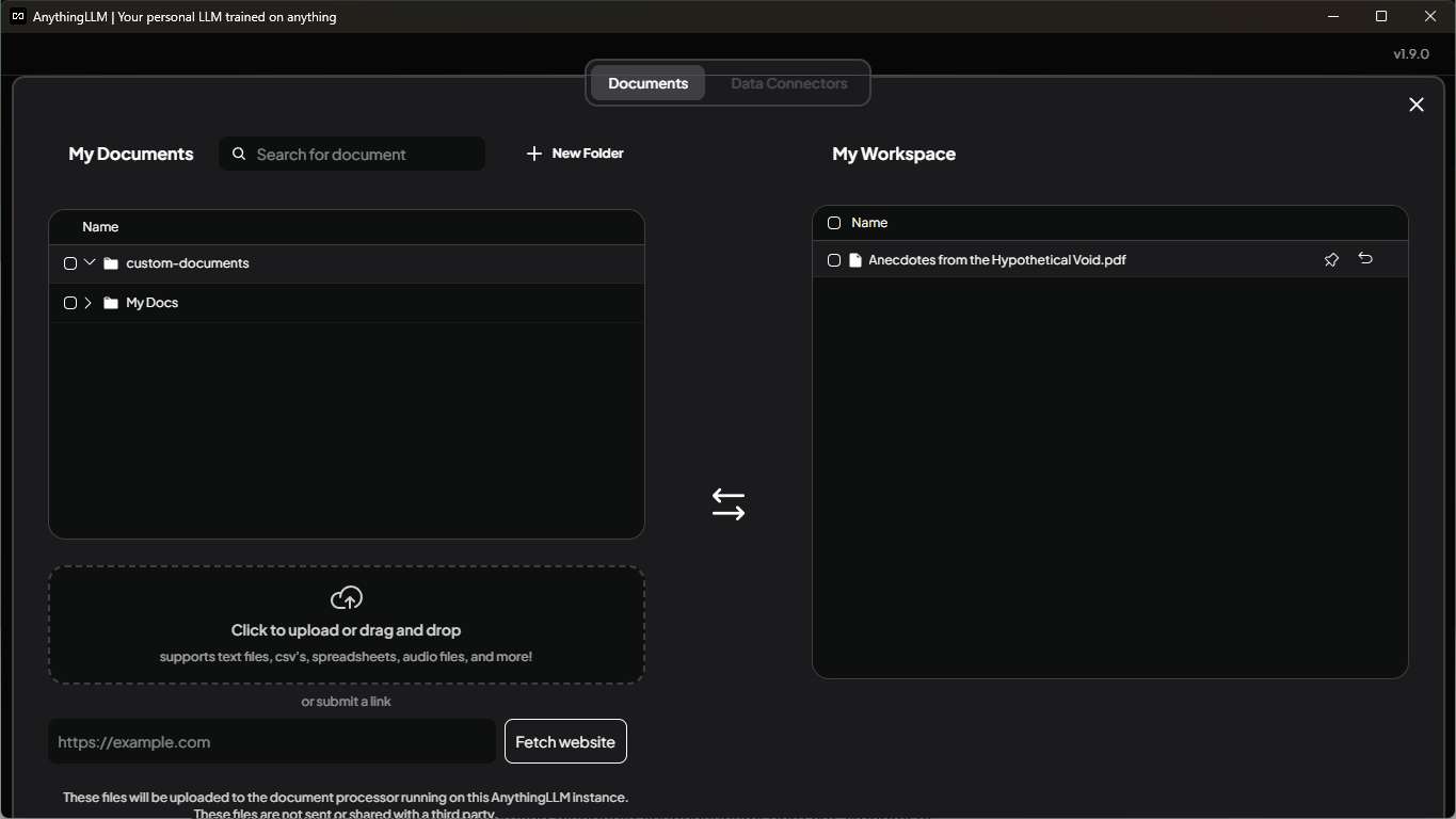 Konečně se dostáváme k nahrání vašich dokumentů. K tomu budete potřebovat pracovní prostor (workspace), tak si ho rovnou vytvořte, pokud ho ještě nemáte. Když pak myší najedete nad název prostoru nebo na něj kliknete, tak byste měli vidět ikonu pro nahrávání dokumentů. Klikněte na ni a potom využijte "Click to upload or drag and drop", abyste vybrali vlastní dokumenty. Jakmile své dokumenty nahrajete, můžete je zaškrtnout a přesunout pomocí tlačítka "Move to Workspace". Potom, co přesunete požadované dokumenty, tak vpravo dole klikněte na tlačítko "Save and Embed". To může zabrat nějaký čas, záleží na velikosti vašich dokumentů. V mém případě to bylo okolo jedné hodiny zpracovávání několika stovek dokumentů a celkové velikosti několika stovek megabytů. Po zpracování to může vypadat podobně jako na následujícím snímku obrazovky, pro jednoduchost jsem použil jeden dokument.