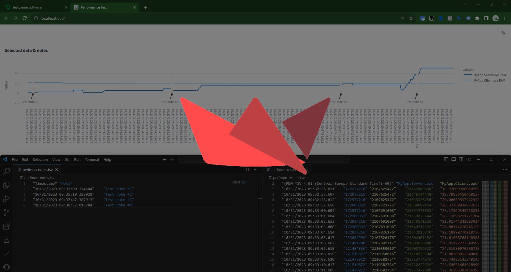 Pomocí pandas.concat() můžeme sloučit více datových zdrojů do jednoho. Stačí tedy výsledky z Performance Monitoru spojit s logem aplikace do jednoho datového zdroje. Já mám v tomhle případně výhodu, protože aplikace, kterou testuji, je modul Pythonu, a můžu si tak snadno vytvořit logovací funkci, kterou použiji ve svých testovacích skriptech pro logování konkrétních kroků: