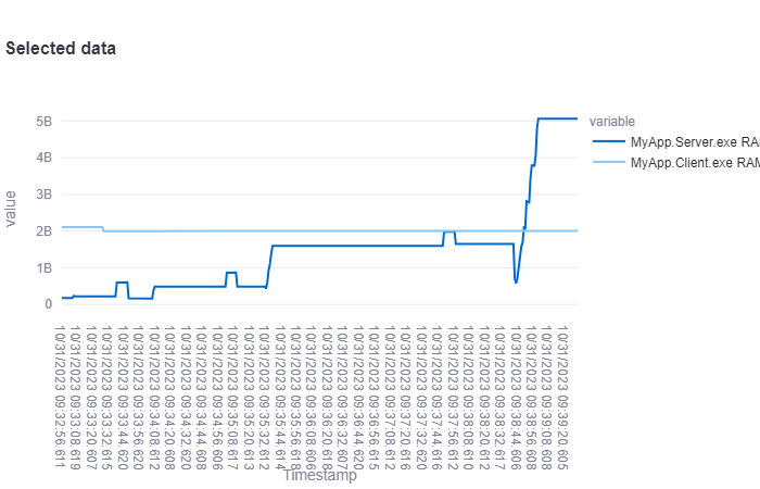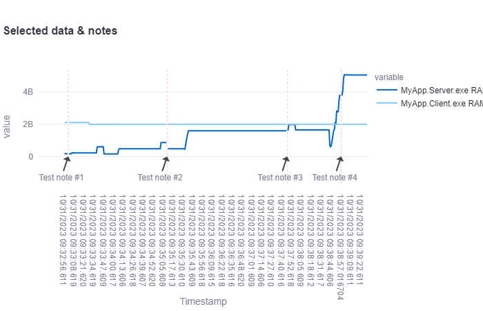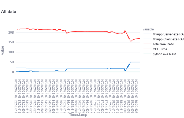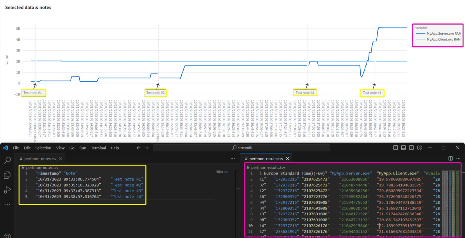 Pomocí pandas.concat() můžeme sloučit více datových zdrojů do jednoho. Stačí tedy výsledky z Performance Monitoru spojit s logem aplikace do jednoho datového zdroje. Já mám v tomhle případně výhodu, protože aplikace, kterou testuji, je modul Pythonu, a můžu si tak snadno vytvořit logovací funkci, kterou použiji ve svých testovacích skriptech pro logování konkrétních kroků: