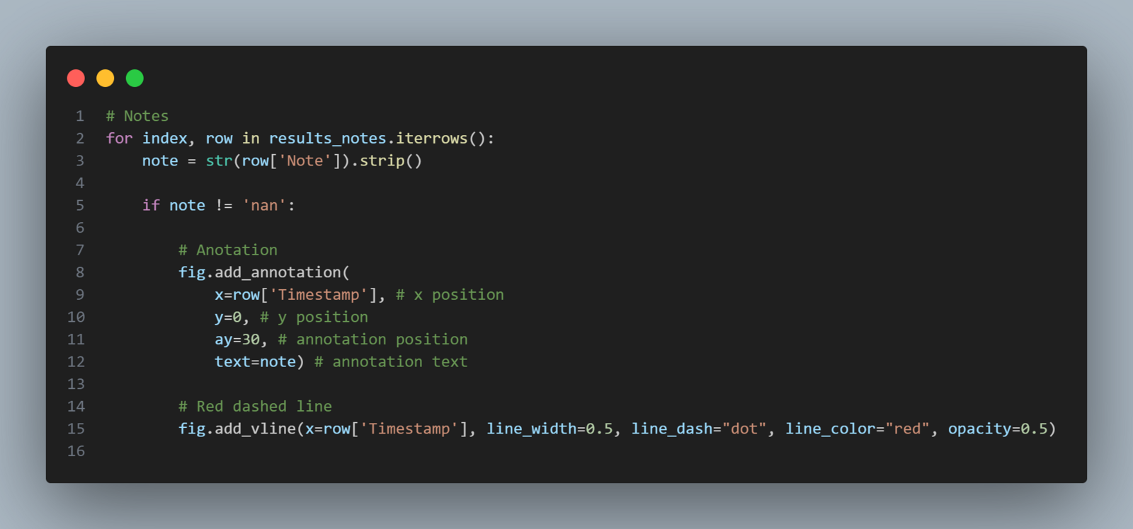 Čárový graf vytvoříme pomocí plotly.express.line() jako v předchozím případě, navíc ale přidáme samotné zprávy z logu aplikace a graf těmito zprávami anotujeme: