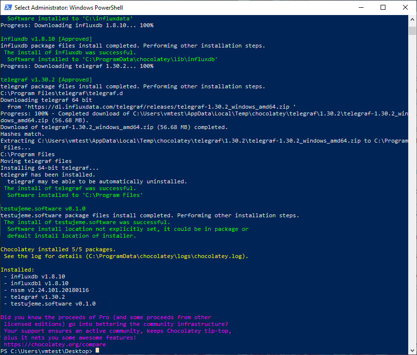 Pro běh naší aplikace zase potřebujeme Influx DB a Telegraf. Opět není problém balíčky s těmito službami najít ve veřejném repositáři, a tak nemusíme nic vytvářet a jen použijeme již existující balíčky jako závislosti. Chocolatey se pak postará o jejich instalaci.