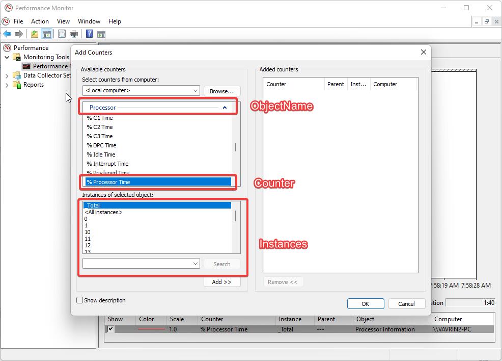 The individual counters behave similarly to the Windows Performance Monitor. Their naming is the same and they are also divided into the same sections. We will explain this in the figure below: